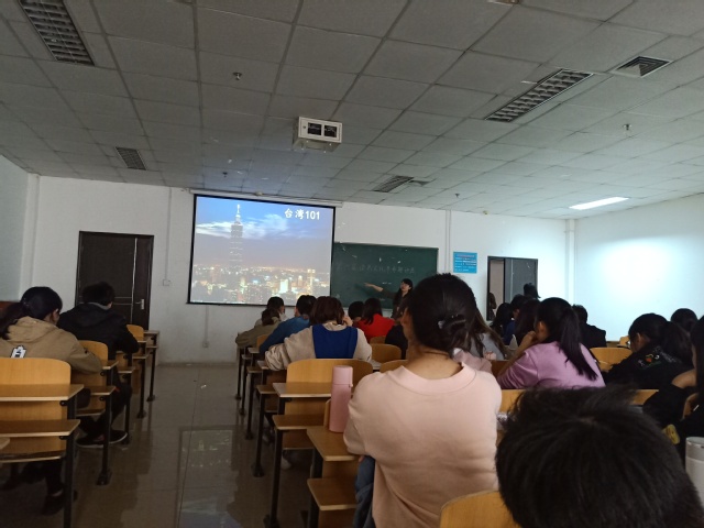 侯立老师讲述了她在台湾的求学经历并对台湾文化做了总体的分析,从旅游、寺庙、饮食和娱乐四个方面为同学们做了更加深入的介绍。她谈到位于台北市中心商业区的101大楼,是台湾标志性的建筑,曾在此举办过烟火跨年活动和国际攀爬活动等。还有日月潭、阳明山、阿里山龙湖、天池等台湾的著名风景区。在寺庙文化上,她主要介绍了具有近现代化装饰风格的中台禅寺,此外还有龙山寺、北港朝天宫。谈到饮食文化和娱乐文化时,侯立老师为同学们推荐了许多美味的饮食,例如四神汤、龙山寺小吃等。