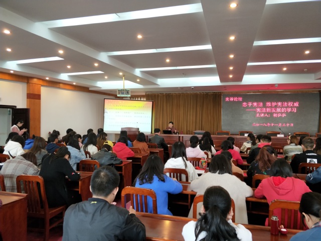 胡弘弘紧紧围绕“忠于宪法,维护宪法权威——宪法新发展的学习”的主题,结合十九大报告原文详细阐述十九大报告对法治建设的引领作用,并强调宪法之于法治建设的重要意义。她强调,十九大报告中共有34处体现“法治”,19处体现“依法治国”;依法治国首先要坚持依宪治国,依法执政关键是依宪执政。她从内容、程序、效力三个方面阐述宪法的根本法地位。她表示,宪法在内容上较普通法更为全面和重大,在程序上较普通法律的制定和修改更为严格和复杂,在效力上居于最高法律地位。