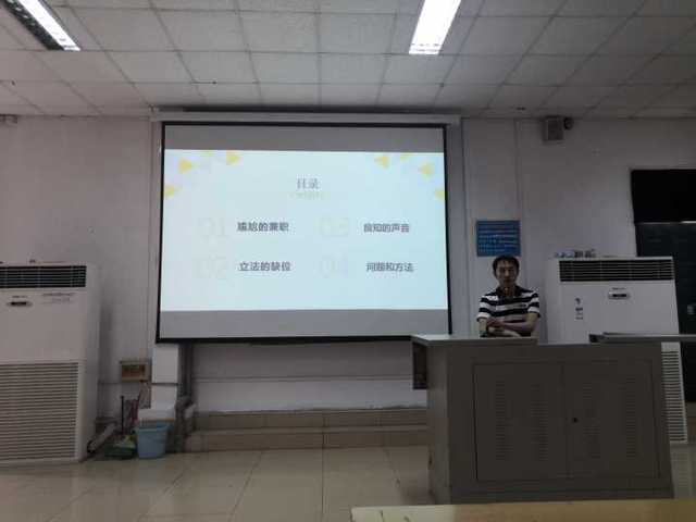他通过列举一些法律条文,向同学们展示立法在大学生兼职问题上存在的不足之处。他指出,很多用人单位利用立法的缺位,否认大学生与其之间的劳动关系,使大学生的权利得不到有效行使与保障。随后,他说道:“虽然立法缺位带来的社会问题令人痛心,但是现今社会上存在一些良知的声音。” 他指出,许多研究劳动法的学者就大学生兼职问题提出了利于大学生的观点,希望同学们对此不要过于紧张。