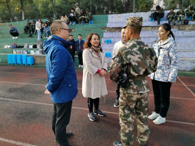 本网讯(通讯员余婵)11月10日以来,我们学生在学院领导老师和教官的指导下积极投身训练。11月18日下午,我们党总支书记尹德蓉、党总支副书记宋平、学工办主任樊勇、辅导员王一一行进行新生军训走访。