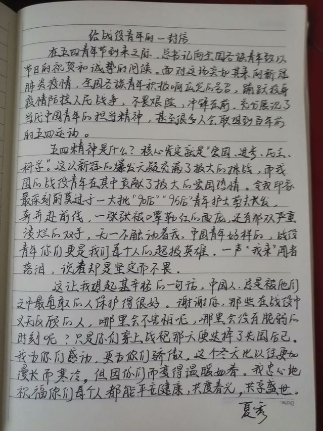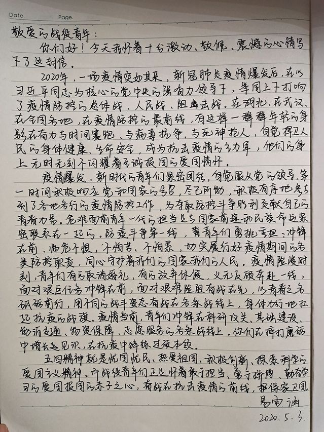 “青春因磨砺才更出彩,人生因奋斗而升华。新冠肺炎爆发以来,许许多多的青年积极响应号召,奋战抗疫一线,展现了新时代中国青年的责任意识与担当精神……”2019级思想政治教育1班李儒梅在她的手写信中这样写到。