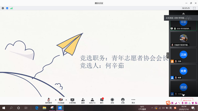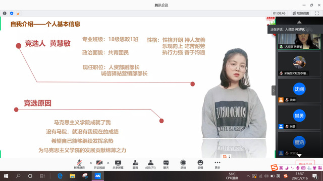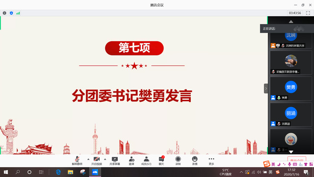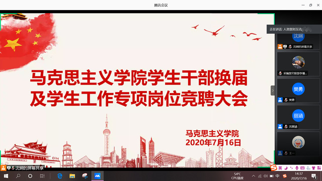 本网讯(通讯员 李珊露)7月16日下午,伟徳官网通过线上腾讯会议开展分团委学生干部换届及学生工作专项岗位竞聘大会。伟徳官网党总支副书记宋平、分团委书记樊勇、辅导员王一及分团委全体成员与会。