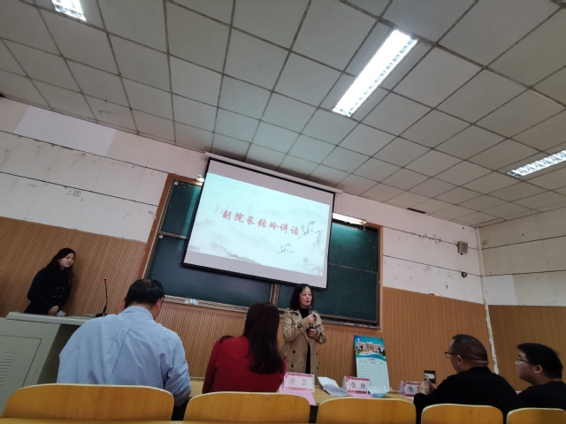 张玲发表讲话。首先,她向学生总体介绍了我国国民的相关阅读数据。接着,她结合身边的真实例子从个人发展、民族发展等方面讲述读书的意义。在读书方法上,她建议学生分阶段阅读,同时她提醒在座的学生在读书过程中要有毅力,要制定从易到难的规划,养成整理读书笔记的好习惯。