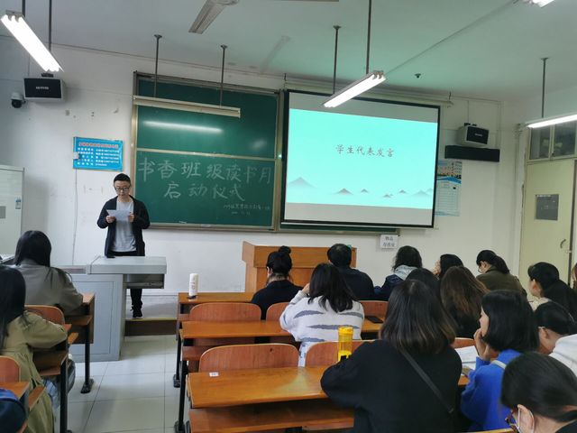 随后,2019级思想政治教育1班班长兼团支书谌鹏程作为学生代表发言,他结合读书的三阶段强调读书的作用,“三更灯会五更鸡,正是男儿读书时,如今的我们,正是风华正茂的年纪,正是要好好读书的年纪,腹有诗书气自华,最是书香能致远。”谌鹏程说道。