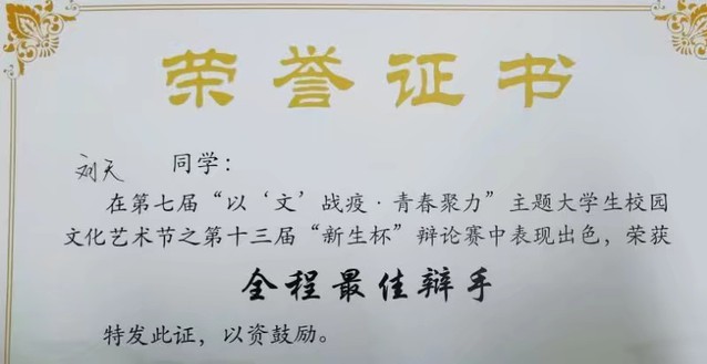 我们辩论队在我校第七届届“以‘文’战疫·青春聚力”校园文化艺术节之第十三届“新生杯”辩论赛决赛中荣获冠军。
