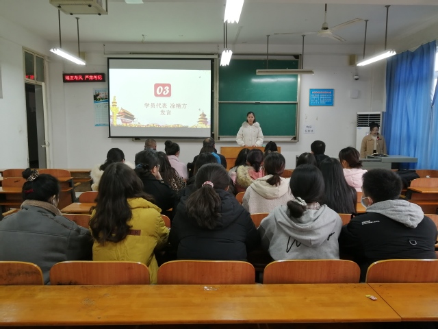 2018级思想政治教育1班凃艳方作为学员代表发言。她通过讲述中国共产党的重要地位与作用,说明此次培训的目的与意义,“为了把这期党课的学习和教育抓好,我们应该做到:认真学习,提升素养;端正入党动机;主动参与,学做合一”,她说道。