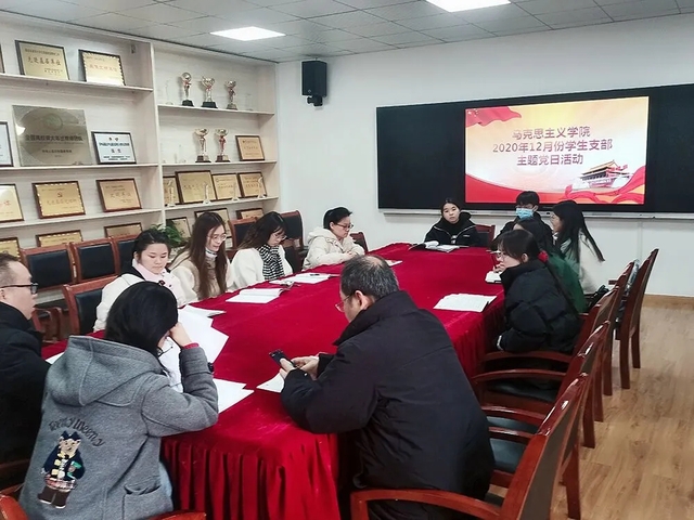 本网讯(通讯员 余希)12月23日中午,我们学生党支部在二号楼会议室开展12月主题党日活动。党总支副书记宋平、学生党支部书记樊勇、副书记王一和我们全体党员同学与会。2017级思想政治教育1班何书彬主持活动。