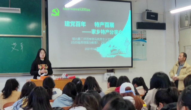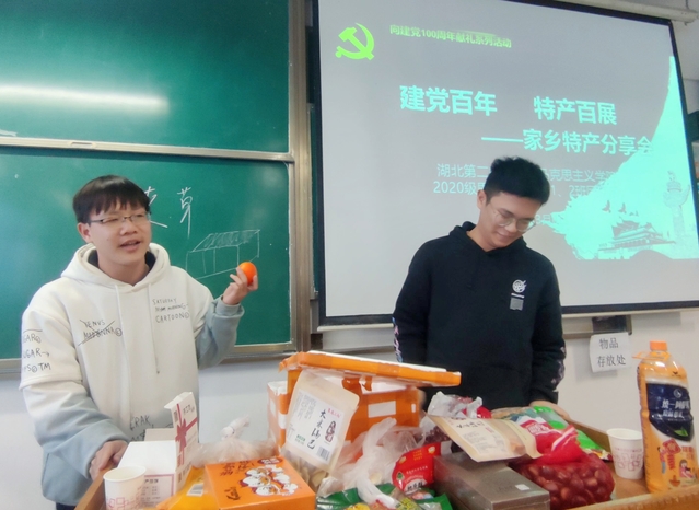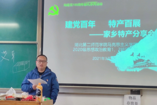 本网讯(通讯员 周媛)3月4日下午,我们于2206教室举行以“建党百年、特产百展”为主题的家乡特产分享会,2020级思想政治教育1、2班辅导员宋平、樊勇及全体学生参与活动。2020级思想政治教育2班粟永硕主持活动。