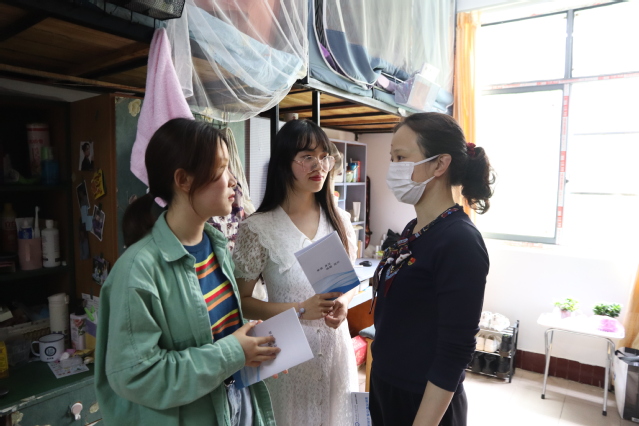 领导老师对于上学期获得“优秀寝室”称号的寝室给予肯定,要求他们自觉遵守寝室文明公约,坚持“三好”建设目标和“四不”基本原则继续保持良好作风,起到模范带头作用。同时,要求其他寝室要积极创建文明寝室。周忠一行来到“藏汉一家亲”的中区十四栋104寝室,并与2020级思想政治教育2班的藏族学生江安拉姆进行亲切交流,周忠详细询问了她近期学习和生活的情况,得知她积极参与暑期社会实践活动,给予了高度赞扬,并提醒有困难直接找老师。临走时,老师们特别嘱咐学生寒暑假乘车时注意安全。