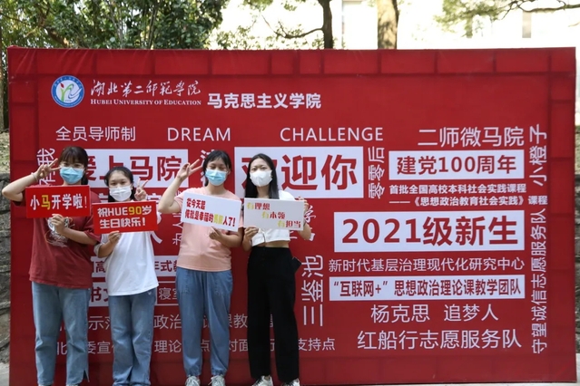 与此同时,我们的“一对一”迎新活动也在进行中。学长学姐在接到一对一的学弟学妹后,先领其到宿舍报到,帮助他们拎行李上楼,待学弟学妹收拾好个人物品后,再带领他们去二号教学楼进行报到。报到期间,新生及家长拿着“朋友圈KT板”,在我们特意制作的桁架前拍照合影,此桁架铺满了建党一百周年和我们目前拥有的国家级、省级教学团队等特色元素的关键词,方便新生及家长更加了解马院。同时,按照马院传统,新生在二号楼报到后领到了我们赠送的大礼包,其中包括辅导员精心挑选的鼠标垫、我们为防止新生被骗亲自编制的防诈骗手册、我们学工办结合建党一百周年主题贴心制作的卡包,卡片的背面内容为新生生日当天发生的党员故事,另外,卡包还可以装上一卡通,防止丢失。