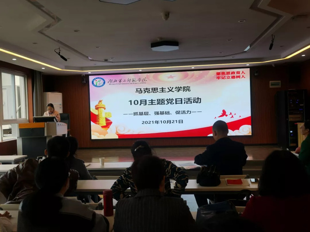 10月21日14:00,为深入贯彻落实中央有关精神,根据中共湖北省委组织部和省委教育工委要求,结合学校有关工作安排和伟徳官网实际(以下简称马院),在1号楼智慧马院教室开展了马院10月份支部主题党日活动,活动主题为“抓基层、强基础、促活力”,马院全体教职员工参加了本次会议。