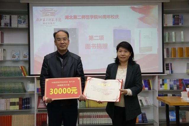 仪式第二项,肖金刚代张竹林向我校图书馆捐赠总价值30000元的由张竹林撰写的两部学术著作《仰望教育星空 我的教育观察与思考》与《教师家庭教育 指导能力建设论》。彭敏代表学校接收捐赠图书并向张竹林颁发捐赠证书,同时在现场赠送张竹林的书籍给到场的学生阅读学习。肖金刚代表张竹林进行发言,肖金刚表示捐赠图书有三个目的,第一是为母校增砖添瓦,尽绵薄之力;第二是感恩母校,回馈母校;第三是把校友工作、学习的成果向大家分享。同时他还表达了三个祝愿,祝愿母校越来越好,祝愿所有领导及老师身体健康、工作顺利,祝愿学生们努力学习知识,学有所成。