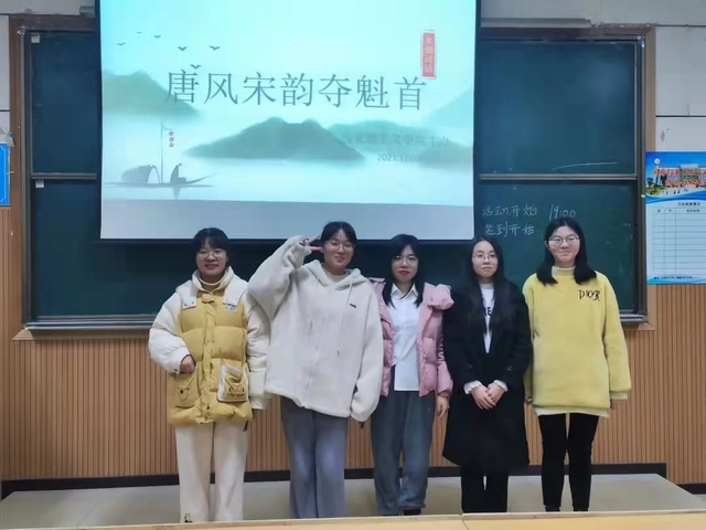 本网讯(通讯员 刘佳慧)12月2日晚,我们于阶梯教室2举办“唐风宋韵夺魁首”诗词竞赛活动,我们2020级、2021级思想政治教育专业部分学生参加比赛,2021级思想政治教育1班易显琪担任主持人。