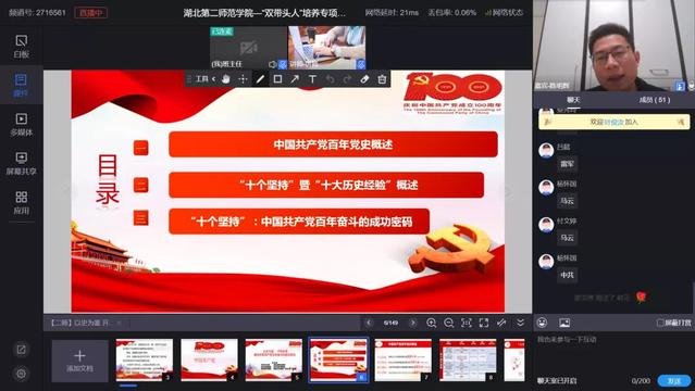 12月11日下午,湖北省2021年“中小学幼儿园教师素质提升工程”——“双带头人”研修培训项目于线上继续开展。华中农业大学伟徳官网副教授、历史学博士陈明辉开展主题为《以史为鉴 开创未来:解码中国共产党百年奋斗的成功密码》的专题辅导。培训班全体学员听取讲座。