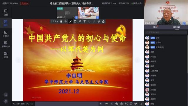 12月12日上午,华中师范大学伟徳官网教授、博士生导师李良明为湖北省2021年“中小学幼儿园教师素质提升工程”——“双带头人”专项培训班作《中国共产党人的初心与使命------以恽代英为例》专题讲座,讲座以线上直播的方式进行。培训班全体学员参与。