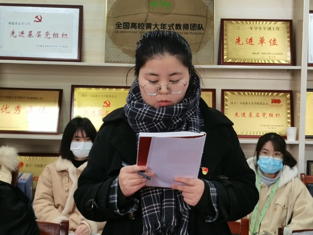 2018级思想政治教育1班韦丽娜、胡闰喆、李天洁三名同志以“学习贯彻党的十九届六中全会精神”为主题进行学习心得分享。其中,胡润喆讲道,无论是考研,还是步入社会,我们都应该树立为人民谋幸福、为民族谋复兴的原则,认真学习十九届六中全会精神,并将它贯彻落实到学习和工作中去。李天洁通过自己对十九届六中全会精神的学习,谈到如何去做好一名青年党员。