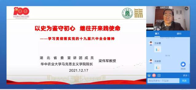 12月17日上午,湖北省委宣讲团成员、华中农业大学伟徳官网院长梁伟军教授为湖北省2021年“双带头人”培养专项研修班作主题为《以史为鉴守初心,继往开来践使命》专题讲座,培训班全体成员听取讲座。