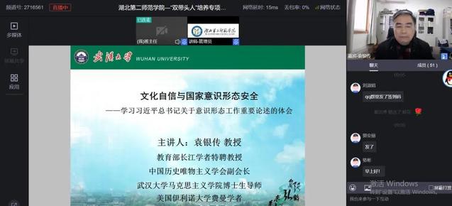 12月15日上午,武汉大学伟徳官网教授、博士生导师袁银传为湖北省2021年“双带头人”专项培训班作《文化自信与维护国家意识形态安全》专题讲座,讲座通过线上直播的方式进行。培训班全体成员前来听取讲座。