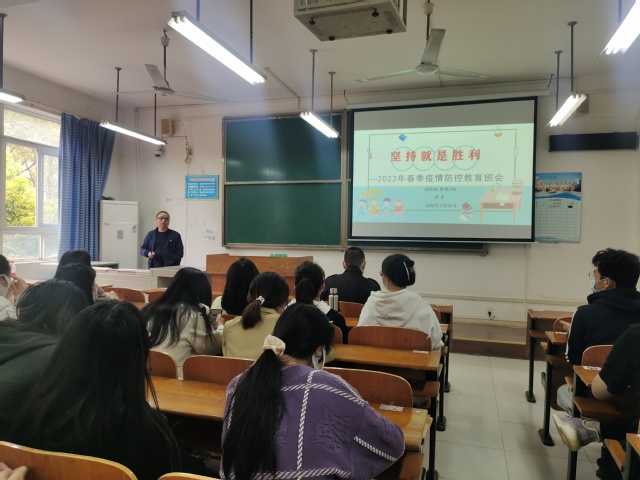 本网讯(通讯员杨思琪)为进一步做好疫情防控工作,3月30日,我们各班于二号楼2205教室、2208教室、2209教室先后召开了以“坚持就是胜利”为主题的2022年春季疫情防控教育班会。我们师友学友行动联系部门组织部相关老师应邀参加,学院党总支书记林志红、副书记宋平、学工办主任樊勇分别去往各班进行春季疫情防控教育,我们全体学生参与此次班会。其中,2018级思想政治教育班因多数同学在赤壁实习则通过腾讯会议开展了线上主题班会。