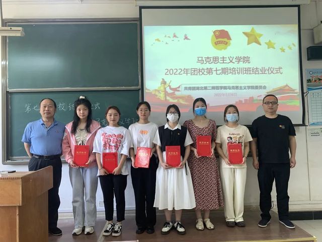 本网讯(通讯员 刘佳慧)5月6日中午,我们于二号楼2202教室举行2022年团校第七期培训班结业仪式。我们党总支副书记宋平、分团委书记樊勇、分团委学生副书记谌鹏程以及团校第七期全体学员参与,2021级思想政治教育2班张雨曦担任主持人。