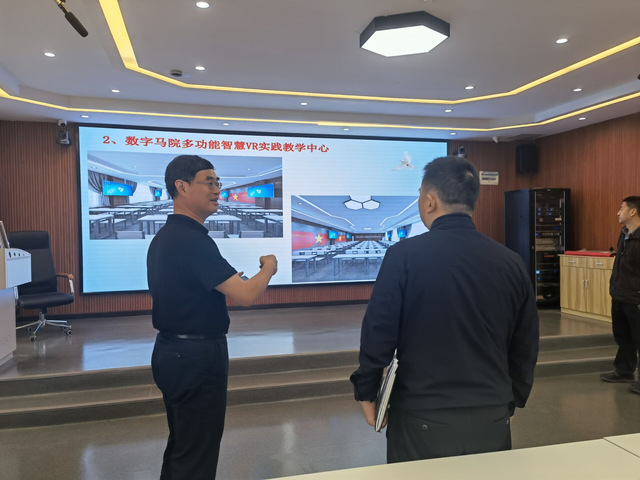 黄红发院长带领调研组先后查看了数字马院多功能智慧VR实践教学中心、数字马院文化展示VR体验大厅、数字马院微课制作中心、数字马院VR教师创客中心、数字马院思政名师课堂研磨中心等,详细介绍了目前建设进度、功能设计、设备布局和使用情况等方面,阐述了存在的困难和后期实验室的建设规划。