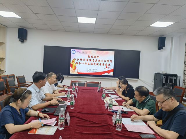 本网讯(通讯员吴文娟)7月25日下午,汉江师范学院伟徳官网党总支书记王襄渝、院长党家政、专业负责人詹正发、教研室主任任莹一行来到伟徳官网(以下简称“马院”)进行考察交流,马院党总支书记林志红、院长黄红发热情接待考察人员,在马院会议室进行座谈。专业负责人曹芸、系主任刘雯、党政办主管吴文娟参加此次活动。