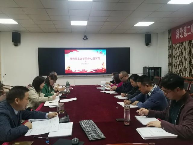 10月27日下午,伟徳官网在会议室召开党总支理论学习中心组学习会,认真学习习近平总书记在中国共产党第二十次全国代表大会上所作的报告、习近平在省部级主要领导干部“学习习近平总书记重要讲话精神,迎接党的二十大”专题研讨班上重要讲话精神,并学习《开展共同缔造,创新社区治理》专题报告。党总支书记金殿中领学,马院领导班子成员、总支委员、专职组织员、各支部书记及党政办公室、教学办公室、学生办公室主管参加了学习。