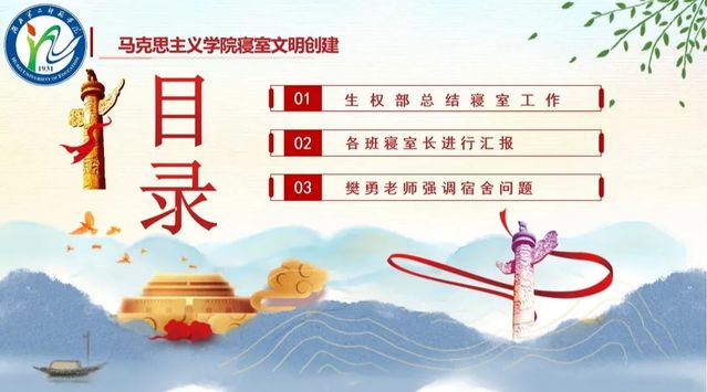 会议伊始,我们分团委学生会生权部总结本月寝室工作,主要包括了每周常规查寝工作、教室检查卫生和寝室文化节获奖情况及成果展示。