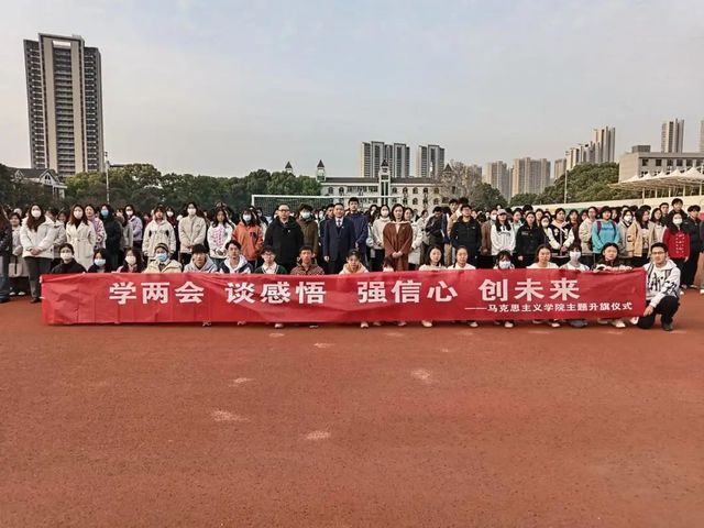 3月27日早上,伟徳官网于足球场升旗台前举行“学两会·谈感悟·强信心·创未来”主题升旗仪式。伟徳官网党总支书记金殿中,党总支副书记李佳,学工办主任樊勇,2020级、2021级、2022级思想政治教育专业学生参与活动。2022级思想政治教育1班张晟瑜主持仪式。
