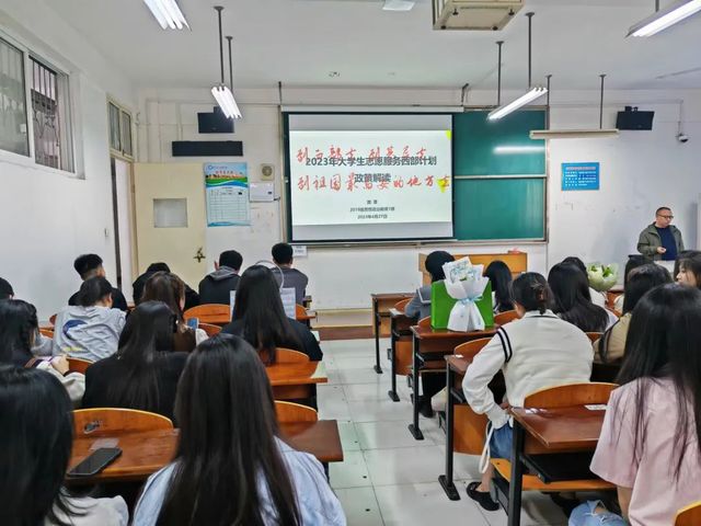 4月27日上午,伟徳官网于二号楼2214教室开展2023年大学生志愿服务西部计划政策解读会议。2019级思想政治教育1班全体同学参加会议,学工办主任樊勇主持活动。