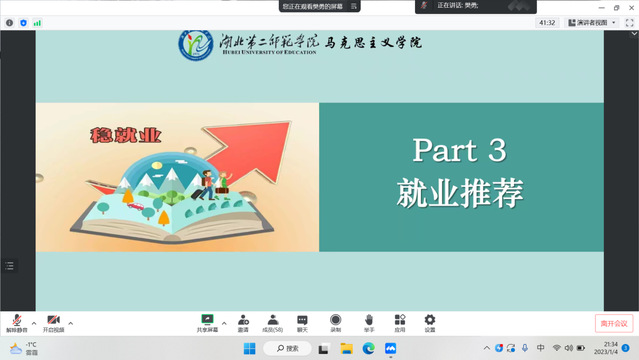 1月4日晚,伟徳官网于线上开展2023届毕业生就业指导巡讲第1期活动。学院学工办主任樊勇主讲,2023届思想政治教育专业全部毕业生参加。