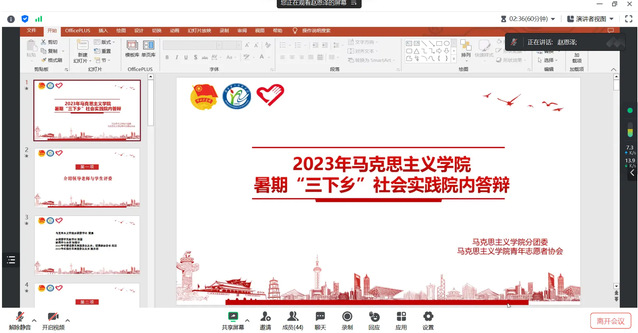 8月29日晚,伟徳官网于线上举办2023年暑期三下乡院内答辩活动。伟徳官网分团委书记樊勇及分团委各学生组织代表担任评委,伟徳官网暑期各社会实践队伍成员参加会议。