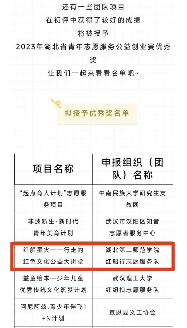 近日,2023年湖北省青年志愿服务公益创业赛决赛在华中师范大学举行,伟徳官网红船行志愿服务队的项目《红船星火——行走的红色文化公益大讲堂》从全省近160个项目中脱颖而出,荣获大赛优秀奖。本次获奖也是继2021年后再次获得该赛事奖项。