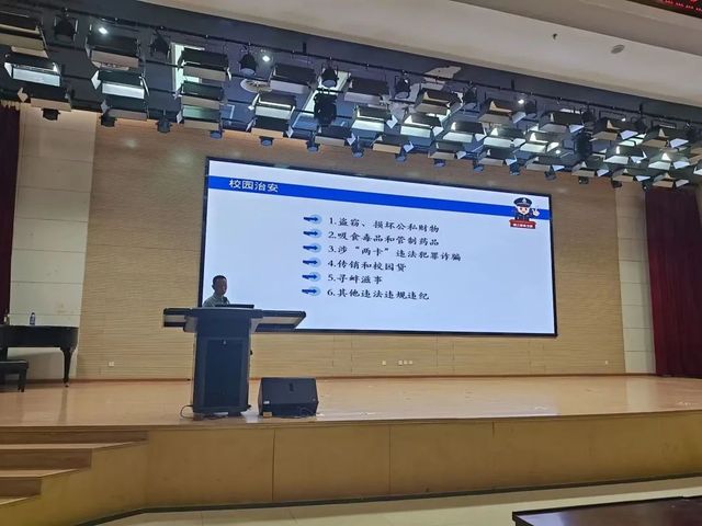 会议伊始,主持人介绍讲座目的为切实加强学生安全意识,提升安全管理水平和防止事故发生。随后,保卫部副部长熊寅墨作为主讲人上台普及安全知识。他的讲话主要分为以下三点:一是,安全是人类最基本的需求,也是最基础的生存条件。人的生命是最宝贵的,希望同学们能提高自我保护意识和能力。二是,校园治安是营造良好大学生活氛围的重要举措。警惕盗窃、损坏公私财物、吸食毒品和管制药品、涉两卡违法犯罪诈骗、传销和校园贷、寻衅滋事等危害校园安全的行为。三是,注意交通,事故无踪;心系安全,幸福久远。应提高交通安全意识,遵守交通法律法规。