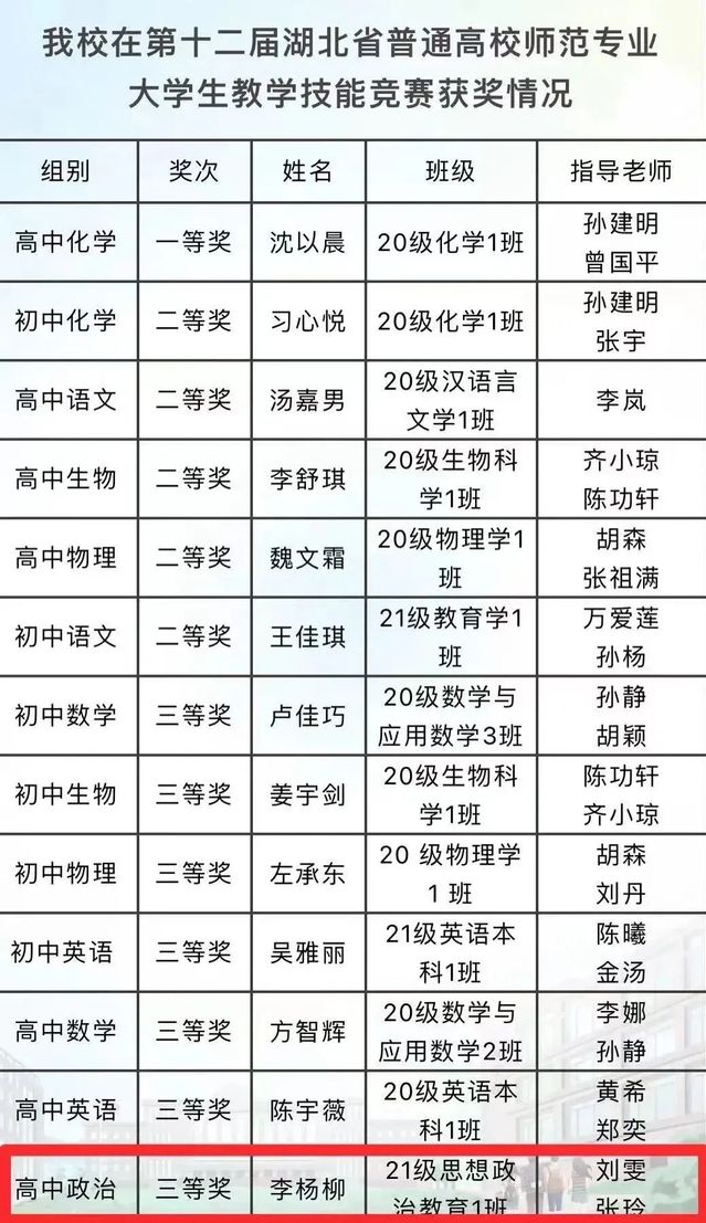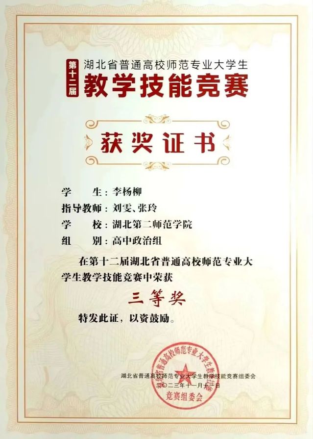 近日,由湖北省教育厅举办的第十二届普通高校师范专业大学生教学技能竞赛获奖名单公示,本次大赛共有全省16所师范专业高等院校的两百余名选手参赛。其中,伟徳官网2021级思想政治教育1班李杨柳在此次竞赛中脱颖而出,荣获高中政治组三等奖。