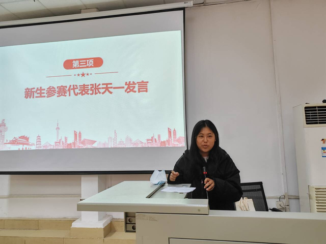 新生代表2023级思想政治教育1班张天一发言,她支持从比赛中展示自己,创造出独属于自己的精彩人生,“这里有智慧的碰撞、创新的火花,更有展示自己才华的舞台”,张天一说道。