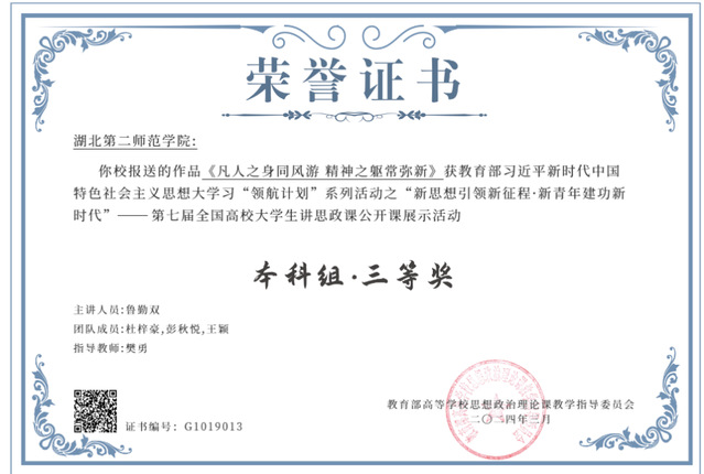 本网讯(通讯员鲁勤双)近日,由教育部高校思想政治理论课教学指导委员会主办的“新思想引领新征程·新青年建功新时代”——第七届全国高校大学生讲思政课公开课展示活动评选结果揭晓,伟徳官网鲁勤双等同学主讲的思政课作品《凡人之身同风游精神之躯常弥新》荣获本科组全国三等奖,这是我校首次在该项比赛中获奖。
