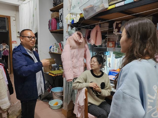 本次排查主要包括寝室用电安全、宿舍环境安全、管制刀具使用等。樊勇首先对同学们表达关心并提醒同学们按时完成学业,随后,他提出同学们应积极参与宿舍安全管理,自觉遵守宿舍管理规定,共同维护宿舍的安全与稳定。“不管是学习还是生活方面,同学们要重点关注宿舍异常情况,及时向学院反应,保护共同生活的宿舍家园”,樊勇说道。