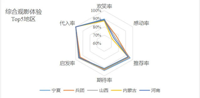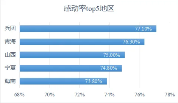 感动率TOP5分别是兵团、青海、山西、宁夏和海南,前三名感动率均在75%以上。千里黄云路,儿女泪沾巾,看来在长风山海之间,更能放大这部电影的思政柔情。