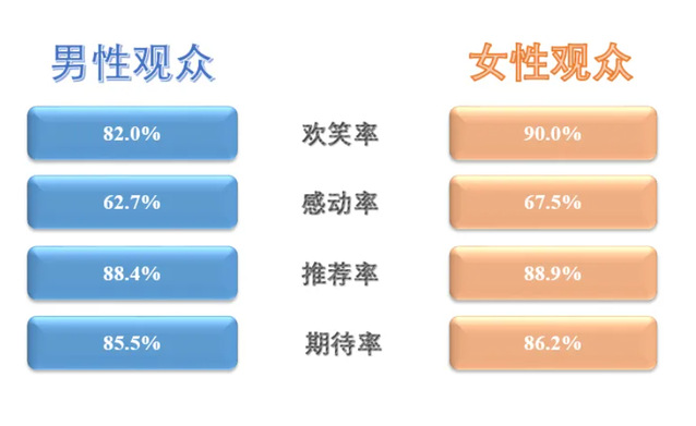 参与本次观影调研年龄最小和最大的观众分别为14岁和84岁,观众平均年龄25.3岁,29岁以下观众占比79.4%,男性观众占比37.6%,女性观众占比62.4%。女性观众从电影中获得了更多的欢乐和感动,同时男女观众对影片的推荐率和期待率基本一致,理智与情感得到很好的平衡。