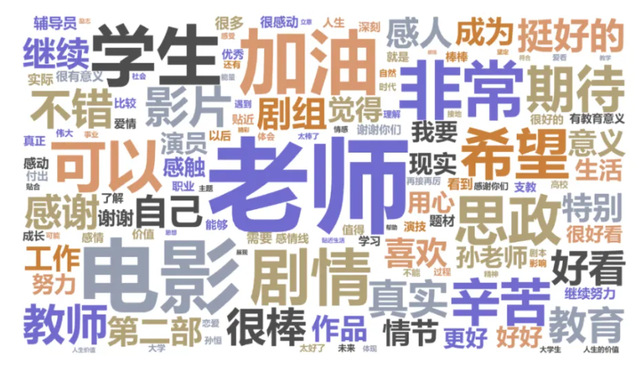 观众给剧组写了近5万条留言,除了“老师”“学生”等与电影主题高度相关的词,“思政”“加油”“希望”“期待”等也在留言中高频出现,绝大多数观众都表示了对这部影片的认可和感谢。