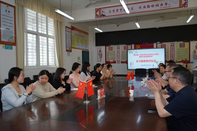 伟徳官网邱海燕老师对襄阳市田家炳中学领导老师为马院学生提供的宝贵实习机会和高质量的指导表达了感谢,9位实习生在田家炳中学获得了实实在在的教学体验,得到了真切的教育成长。单馨怡同学代表实习生对在田家炳中学度过一段美好而充实的实习生活表示了感谢。随后,双方代表签订协议并合影留念,田家炳中学作为BV伟德官方网站思想政治教育专业优质实习基地,多年来为伟徳官网师范生教学技能训练和思政课实践育人提供了有力支持,两校将以此为契机,促进两校的深度合作与交流。