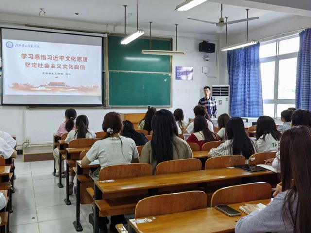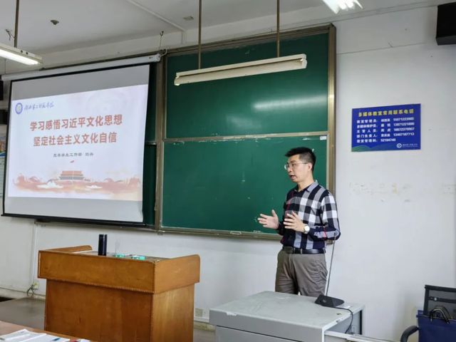 此次党课培训中,刘兴以“学习感悟习近平文化思想,坚定社会主义文化自信”为主题,分别从习近平文化思想的核心要义及逻辑起点、如何充分理解习近平文化思想、新时代青年如何坚定文化自信三个方面具体进行讲解。他强调,革命文化是文化自信之魂,伟大实践是文化自信之基,守正创新是文化自信之源,要坚定理想信念,坚定文化自信,感悟思想的力量,培育和践行社会主义核心价值观运用于生活实际,落到细处、小处、实处。课堂上,同学们认真学习,积极回答问题,并及时做好笔记。