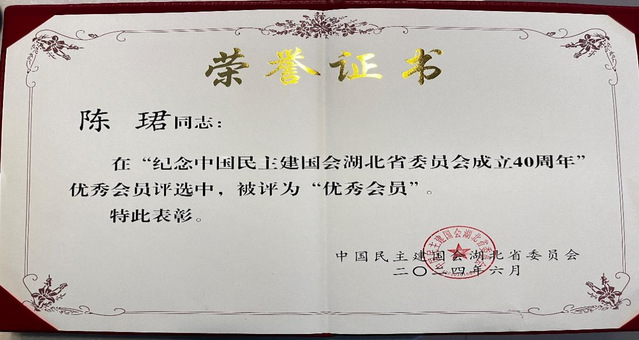 大会对一批先进基层组织和优秀会员、优秀会务工作者进行了表彰。陈珺荣获“民建湖北省委优秀会员”称号。她曾获“民建中央2021年重点理论研究课题优秀成果一等奖”“民建中央2023年重点理论研究课题优秀成果优秀奖”,两张奖状被收录入民建湖北省委成立40周年纪念画册《薪火相传四十载团结奋进新时代》的思想政治建设篇。