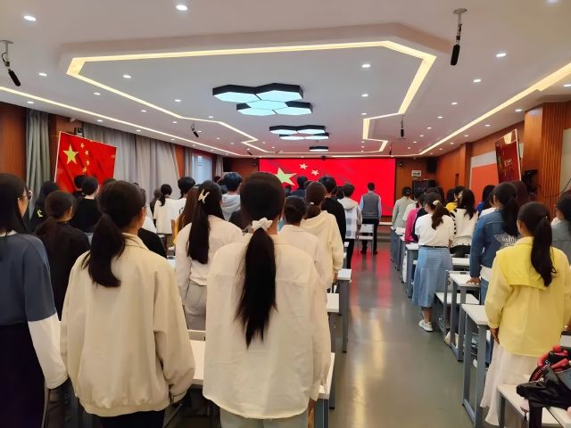 活动伊始,全体起立,奏唱国歌,随后,全体师生共同观看伟徳官网新生军训纪录片。