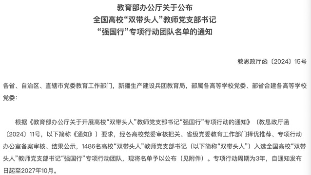 据悉,教育部于今年7月印发通知启动高校“双带头人”教师党支部书记“强国行”专项行动,旨在创新落实立德树人根本任务,不断强化高校“双带头人”队伍建设和作用发挥,充分发挥示范引领作用,引导广大师生在以中国式现代化全面推进强国建设、民族复兴伟业新征程上砥砺新担当、展现新作为。