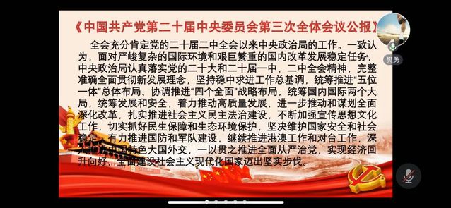 接着,樊勇领学本月学习内容,他先后领学《中国共产党第二十届中央委员会第三次全体会议公报》《中共中央关于进一步全面深化改革,推进中国式现代化的决定》以及相关说明与教育领域涉嫌职务违法犯罪典型实例。