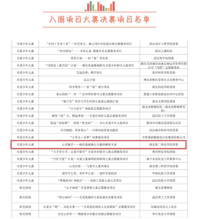 “心灵捕手-做传递健康心力量的解忧专家”项目入围第七届湖北省青年志愿公益项目大赛决赛。项目主要以青少年儿童为重点观察对象,旨在提供一个专业的心理健康志愿服务平台,致力于传递健康的心灵状态,帮助人们解决心理困扰,提升生活质量,促进其身心健康发展,打造独一无二的心灵交流模式,从而更好地帮助青年儿童步入社会,走向未来。