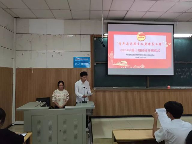 10月16日中午,伟徳官网在阶梯教室2举行第十期团校培训班开班典礼。伟徳官网分团委书记樊勇,2023级、2024级各班团员代表参加仪式,2024级思想政治教育3班谭浩主持典礼。