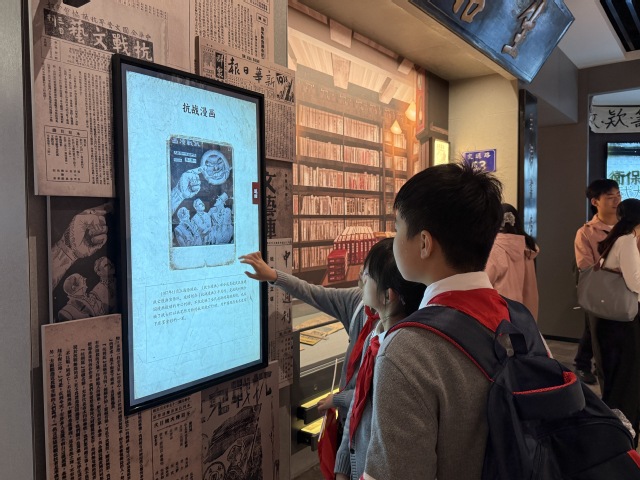 光谷第十二小学余思蕾老师用生动的语言讲述了1938 年武汉“献金运动”:“当时上海、南京已相继沦陷,日军进逼武汉,危急时刻,武汉民众群情激奋……献金运动参与群众达50万,三镇计捐献法币93万余元、金银器1156件、物品774件等”。跟随着余老师讲解,师生们的目光聚焦在展区内展示的献金登记簿复印件上,泛黄的纸张上密密麻麻的名字和金额,见证着 50 万武汉民众共赴国难的爱国情怀。一旁的电子触摸屏前,几名小学生好奇地点击操作,通过互动进一步了解抗战时期的文艺宣传活动,更直观地感受到当时文艺界坚定的抗战信念。